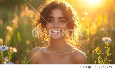 Radiant Woman with Freckles Smiling in a Sunlit Meadow at Golden