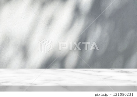 Marble Table with White Stucco Wall Texture Background with Light Beam, Bokeh and Shadow