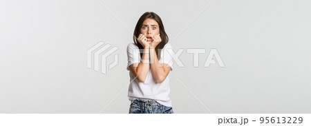 Portrait of surprised and amused brunette girl looking wondered, gasping impressed