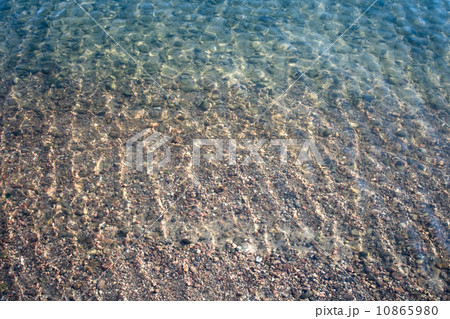 Shallow river water background texture with sand and pebbles on the ground