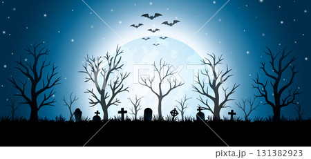 Halloween night background with cemetery, bats and full moon