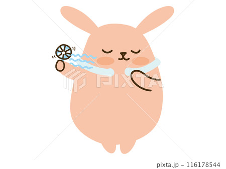 兔子閉上眼睛,使用頸部冷卻器和方便的風扇