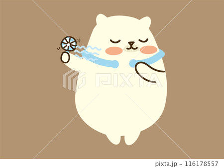 北極熊閉著眼睛,脖子涼爽,有方便的風扇,白色背景