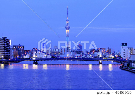 城市風景照亮隅田川上的清水橋和東京晴空塔