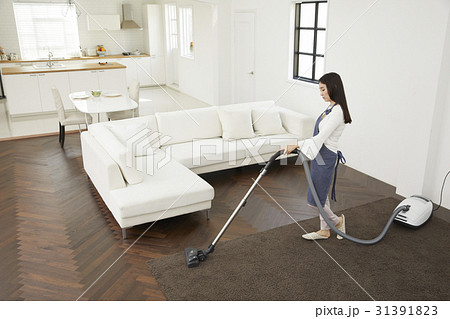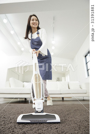 Young modern Asian woman doing house cleaning at home. Confident and independent homemaker maintaining a clean, stylish living space.