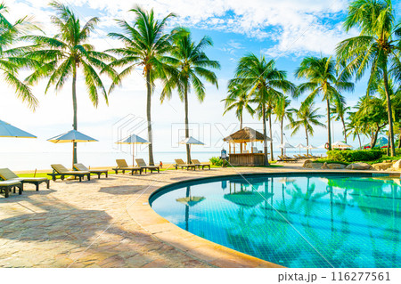 Umbrella and chair around swimming pool in resort hotel for leisure travel and vacation neary sea ocean beach