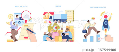 Vector illustration depicting a person celebrating a first job offer, a family moving with packed boxes, and an individual starting a business with a rocket launch concept.