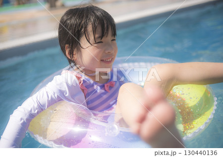 穿著泳衣、戴著游泳圈的男孩和女孩