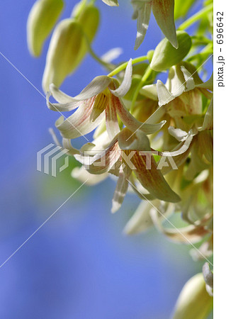 天然植物、花卉。沒有花瓣,奶油色的是萼片。外三者較寬,內三者呈線狀,內側有紫色斑點。