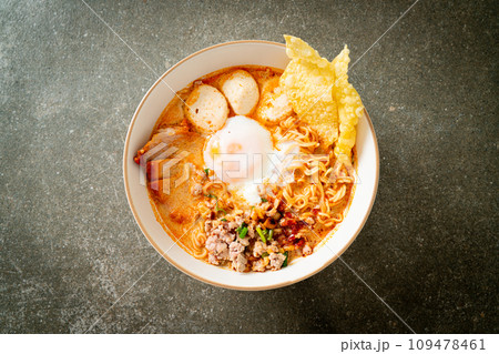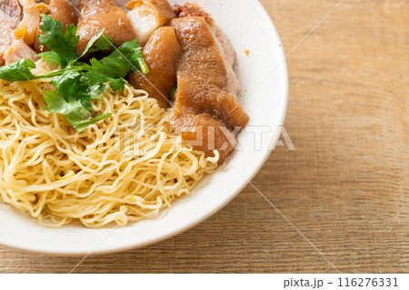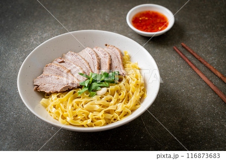 dry Chinese egg yellow noodles with red barbecue pork and dumpling in on plate with clear soup cup