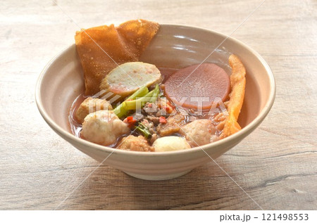 small flat rice noodles with fish balls and shrimp balls in pink soup, Yen Ta Four or Yen Ta Fo