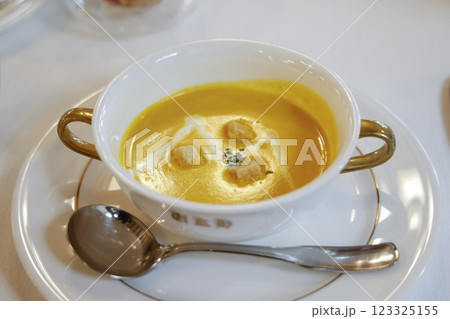 Coconut Milk Stewed Pumpkin,Thai dessert boiled sliced Pumpkin fruit in coconut milk with palm sugar in glass bowl
