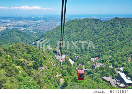 夏季的御在所索道“從山上公園站眺望山峰的紅色纜車排”