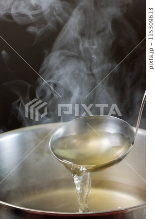 裝有鰹魚片(鰹魚片、國產乾鰹魚片)和鰹魚高湯的鍋以及鰹魚片