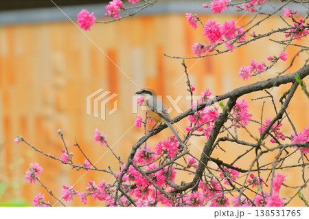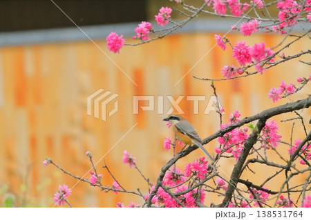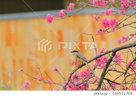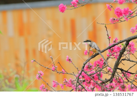 一隻雄性伯勞棲息在一棵菊桃樹上。