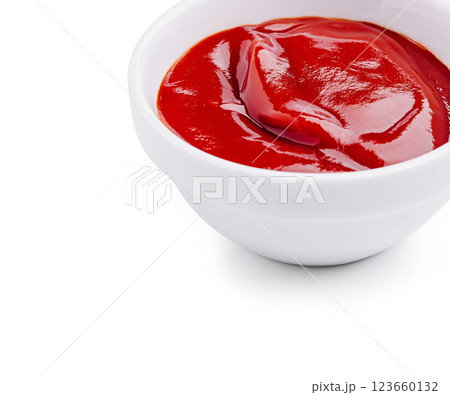 Freshly served ketchup in a white bowl on a clean background