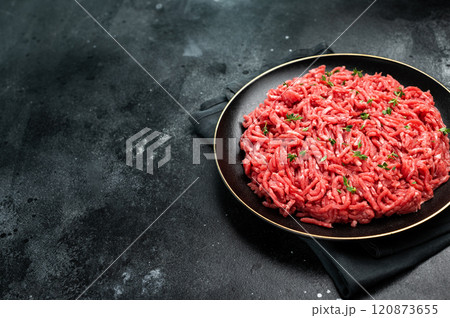 Lamb Mutton ground mince raw meat, forcemeat on a black plate, top view.