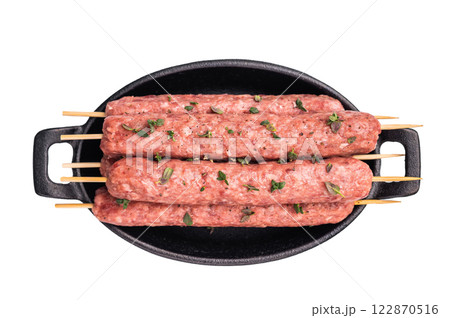 Raw shish kebab, arabic kofta kofte kebab from mince lamb and beef meat on Skewer isolated on white background. top view