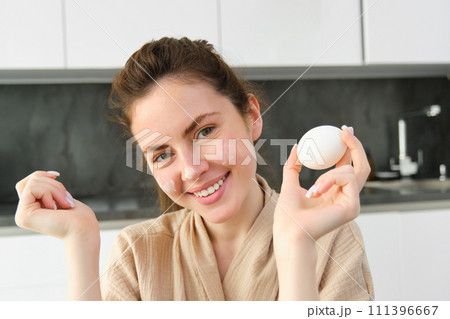 Portrait of a young cheerful asian woman drinking milk in kitchen room with healthy raw food. Vegetarianism, wellbeing and healthy lifestyle concept
