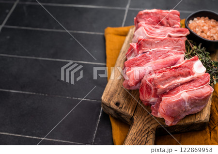 Raw lamb chops, fresh mutton meat cutlets on a ribs. Dark background. Top view. Copy space