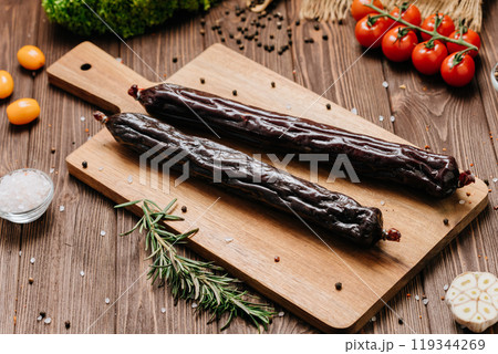 Smoked salami sticks on a wooden board with herbs, perfect for charcuterie boards and gourmet snacks