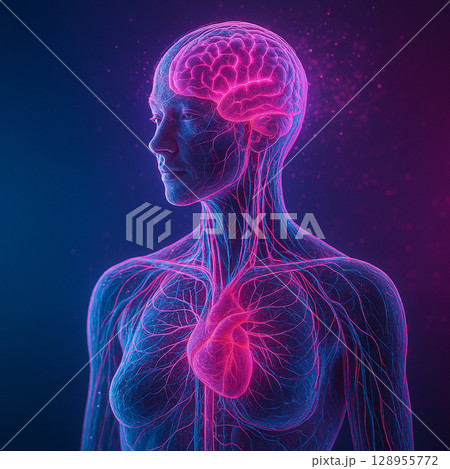 AI generated artistic anatomy showing glowing brain nervous system and heart in neon pink and cyan with translucent body and futuristic energy particles on gradient background