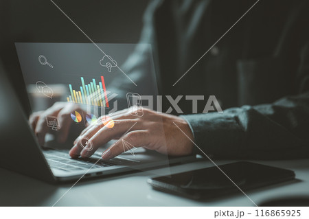 Person typing on a laptop with various data charts and icons. It symbolizes the use of digital technology for data analysis, communication, and cloud computing in a modern work environment.