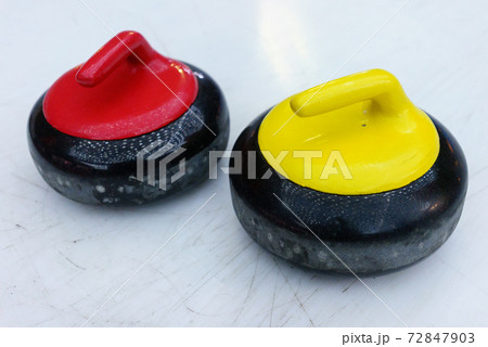 Curling game. Rear view of player playing curling on ice rink with granite stone and broom