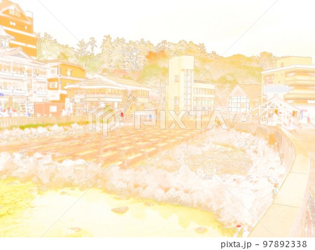 草津溫泉的名勝(湯畠竹)和溫泉街的街道。圖解照片。