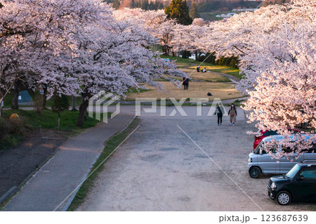 指示牌、櫻花樹和道路 「水的溫暖和櫻花的美麗讓人心曠神怡」 天岩戶之湯(宮崎縣西臼杵郡高千穗町)