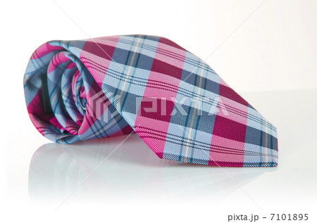 Close-up of a necktie made of blue silk with a geometric pattern, tied with a Windsor knot on a white shirt with a classic collar. Vertical image.