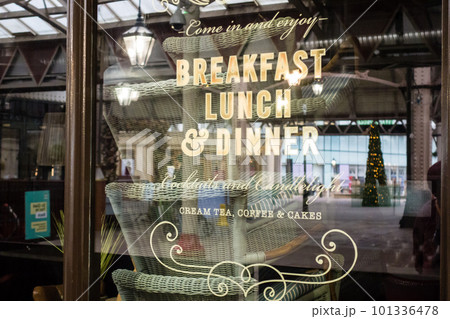 溫莎車站購物中心一家餐廳的櫥窗和玻璃上倒映著一棵聖誕樹