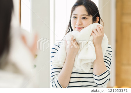 女人在浴室裡用毛巾擦臉