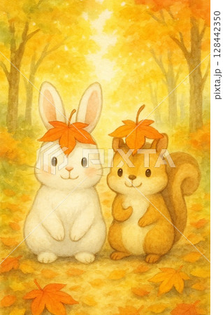 頭上有秋葉的松鼠和兔子