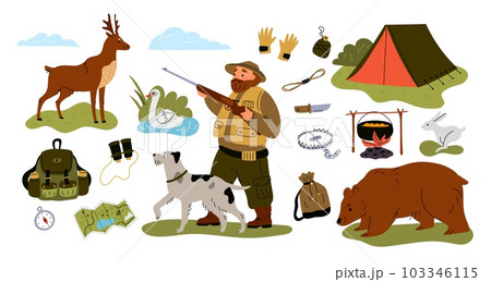 Hunters equipment. Cartoon character hunting with gun and dog. Forest bear and deer. Cooking on bonfire. Binoculars and backpack. Compass and camping tent. Stalking prey. Garish vector set