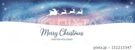 聖誕老人在夜空中飛翔的橫向插圖和可愛的城鎮景觀