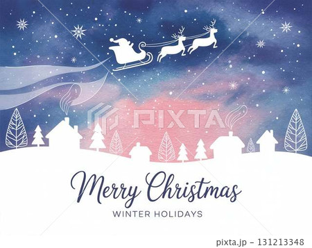 聖誕老人在夜空中奔跑的水彩畫和夢幻般的城市景觀