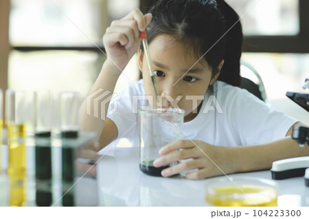 Little child with learning science class in school laboratory