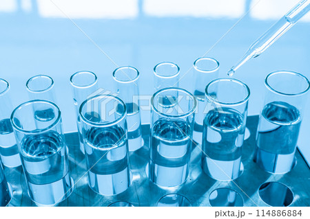 Test tubes with blue liquid water samples and pipette over blue background. Laboratory glassware, science laboratory research concept.