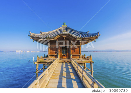 琵琶湖上漂浮的萬月寺浮見堂的晨景