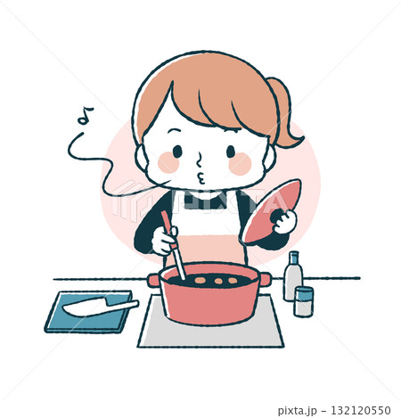 Vector illustration of two people engaged in cooking, demonstrating skill development. One person stirs a pot while another is slicing vegetables, highlighting teamwork and learning.