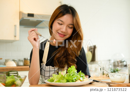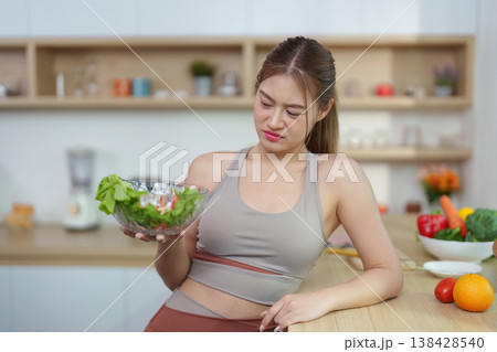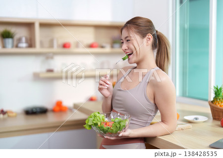 Sporty fit woman standing in modern kitchen, eating salad, looking at plate with fresh ingredients