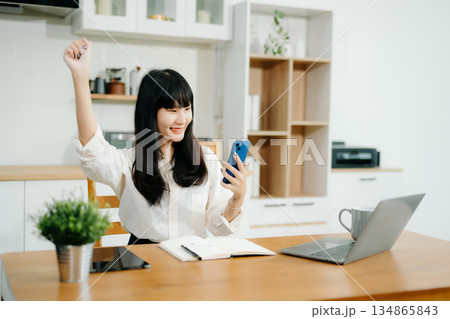 Cheerful businesswoman checking time feeling motivated waiting for leaving office do on their tablet, laptop