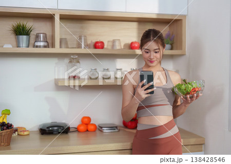 Young woman smiling at smartphone in kitchen planning healthy diet meal prep for weight loss at home