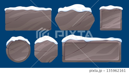 Stone frames of various shapes with snow caps. Christmas empty boards. Round and rectangle frozen billboards. Rock banner covered with snowdrifts. Vector set of stone elements for games