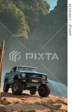 A blue truck is parked on a rocky hill by a waterfall