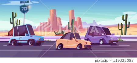 Desert west road and car traffic cartoon landscape