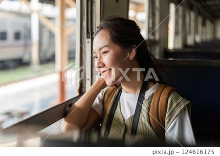 Travel and Adventure. A young woman gazing out the window of a train, reflecting on her journey while experiencing the thrill of travel.