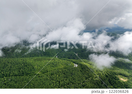 Mountain pass road in North Carolina Appalachian mountains, USA. Blue Ridge Parkway in summer rain season