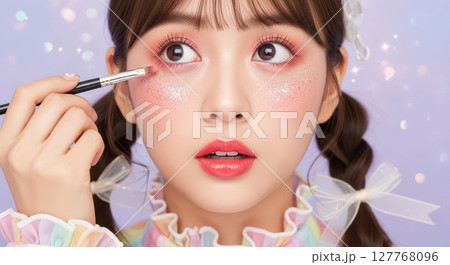 特寫鏡頭:一位年輕女性正在享受流行可愛的閃光妝容,臉上洋溢著可愛的表情(AI 生成的圖像)